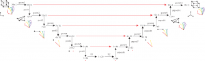 自适应的原理图U-Net架构,用于估计3 d坐标从2 d坐标。在池的每一层,我们大致的节点数量削减一半,而在每个unpooling层,我们图中节点的数目的两倍。图像中的红色箭头是跳过层特性传递到译码器与未共享的连接特性。
